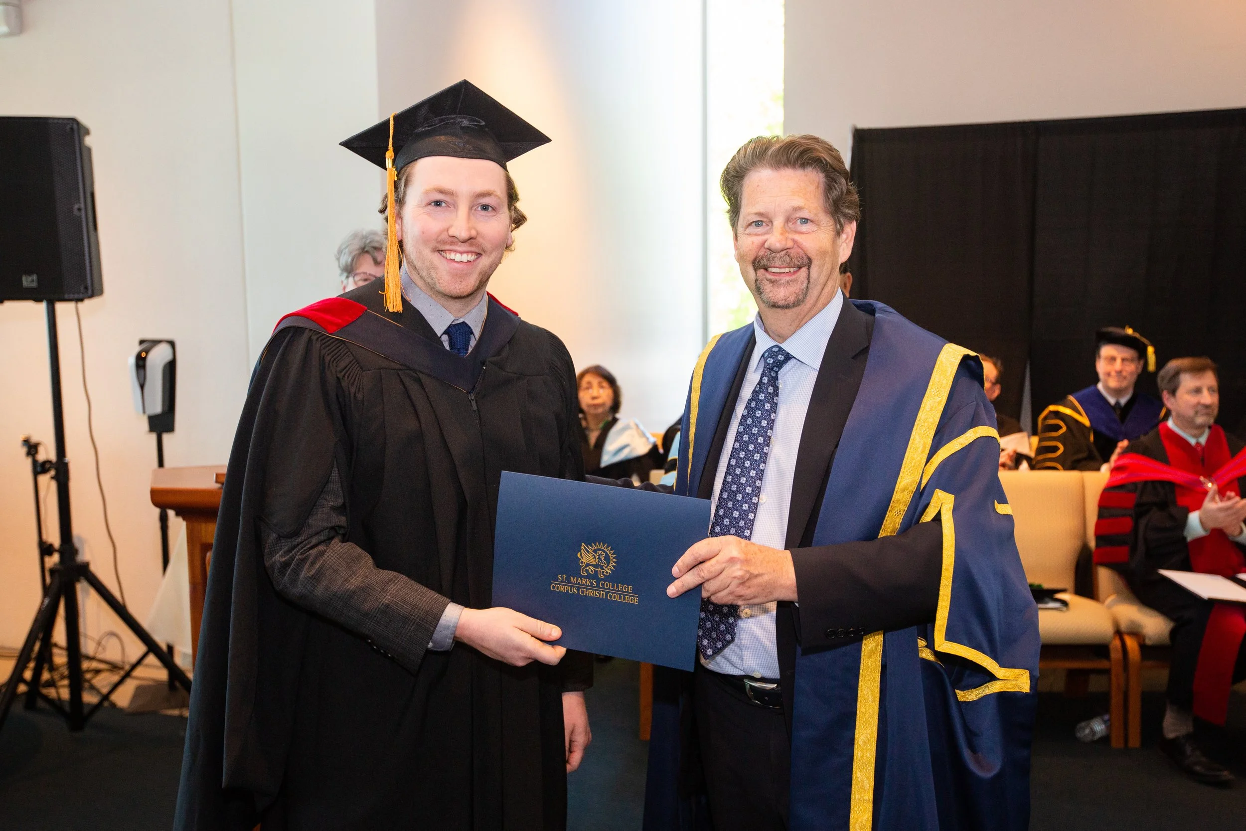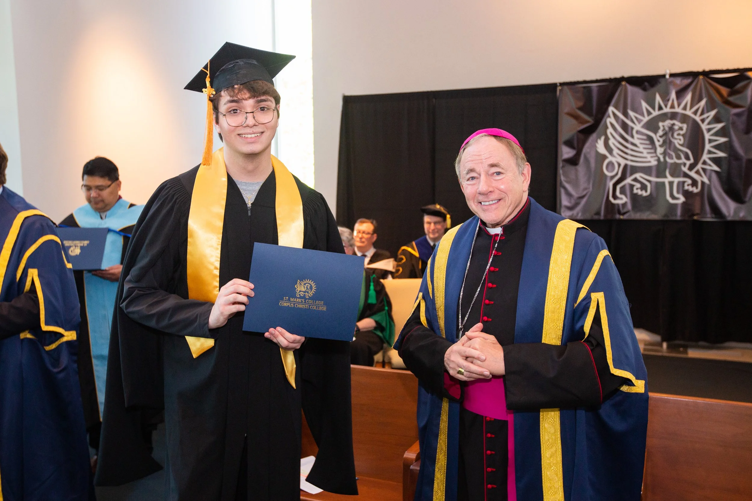 A young man in a black graduation gown with a gold stole holding a diploma, standing next to a man in a blue academic gown with gold trim and a pink bishop's hat, at a graduation ceremony at St. Mark's College.