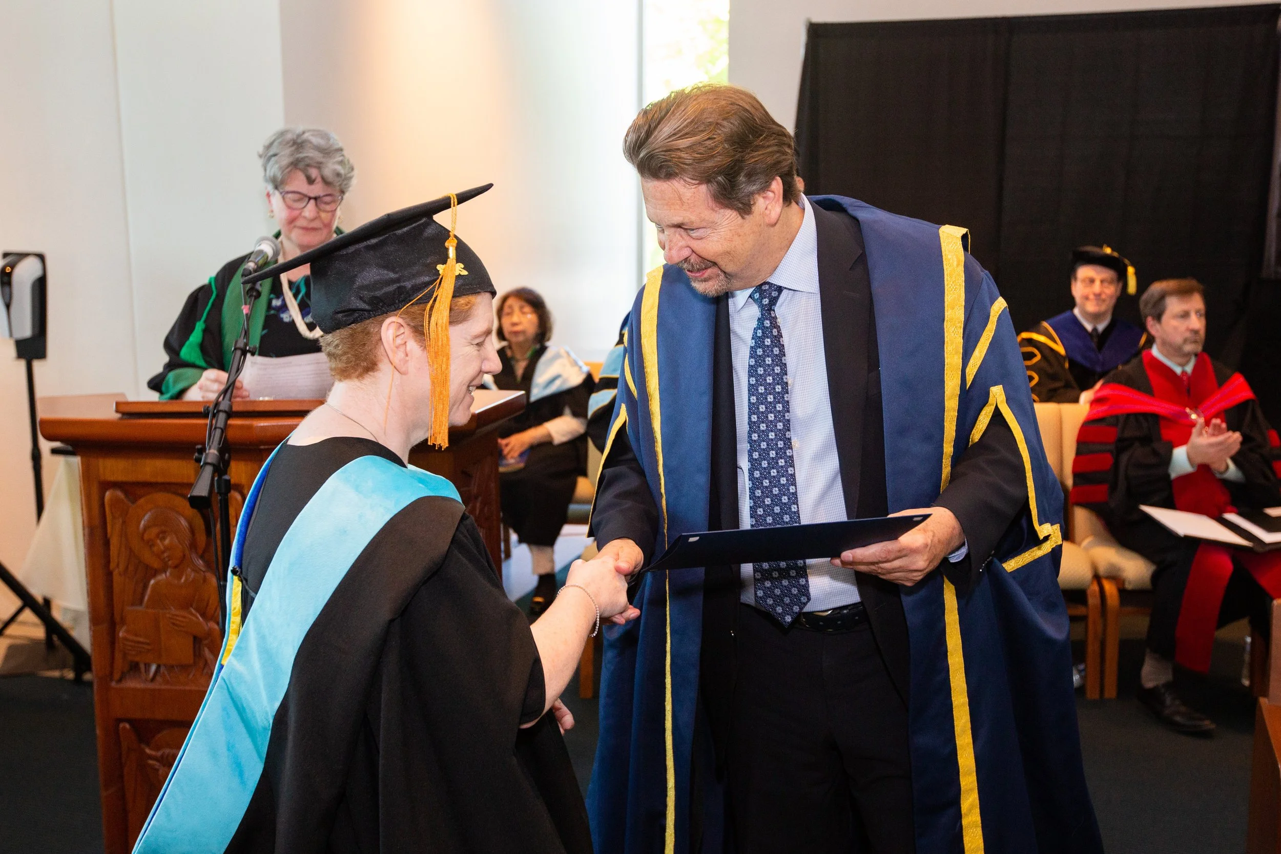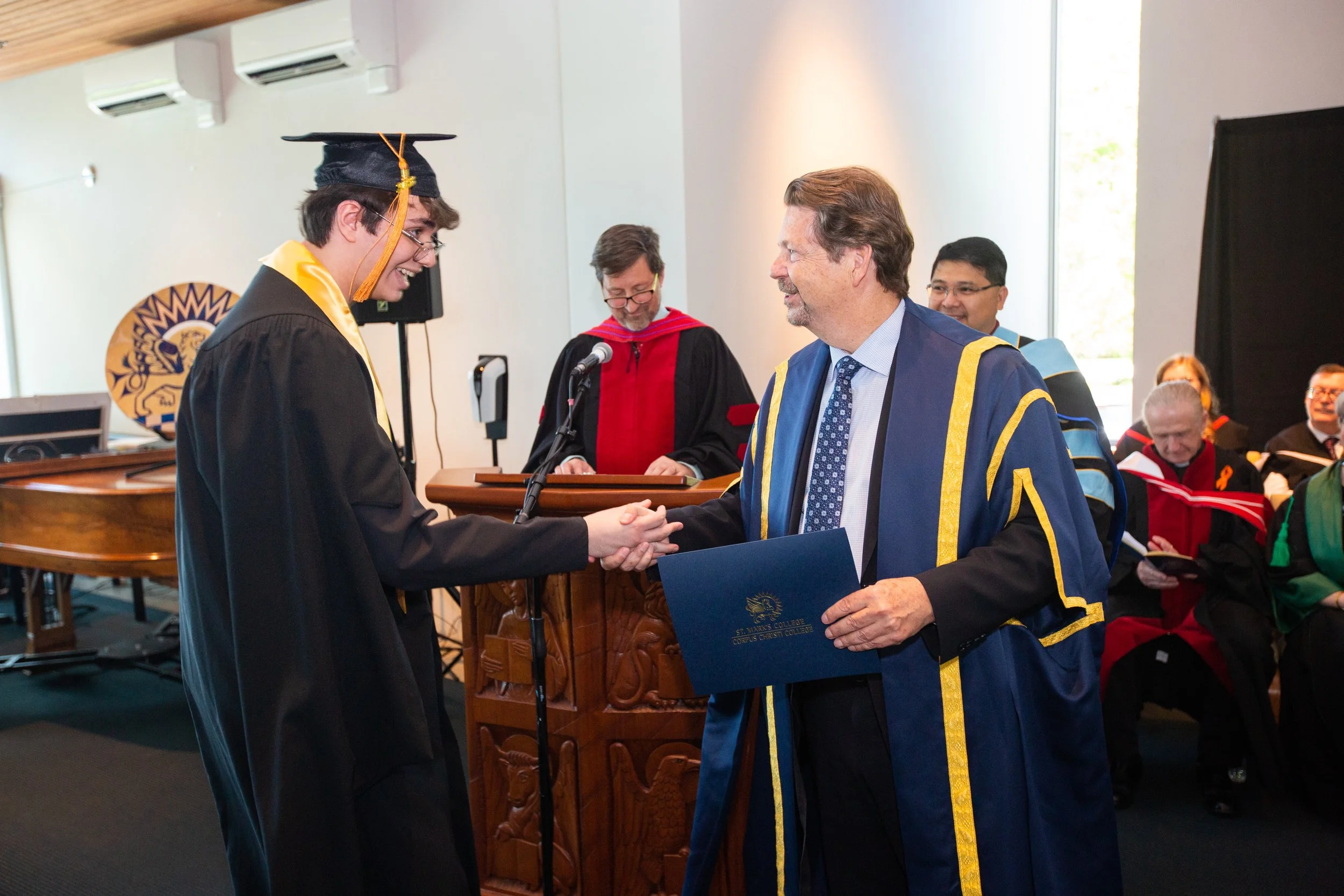 A woman in academic regalia shaking hands with a man in a blue and gold academic gown holding a diploma from St. Mark's College during a graduation ceremony, with other graduates seated in the background.