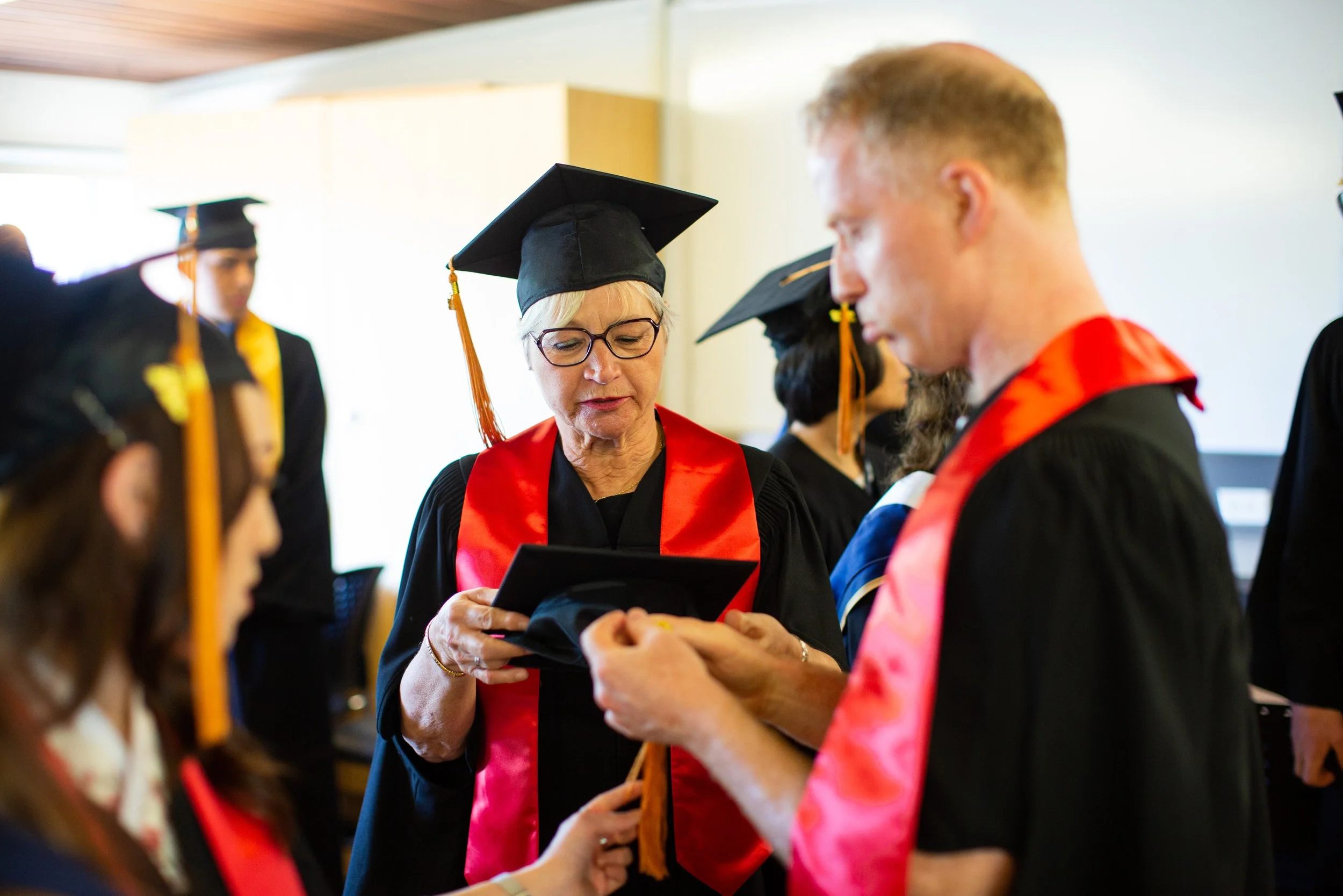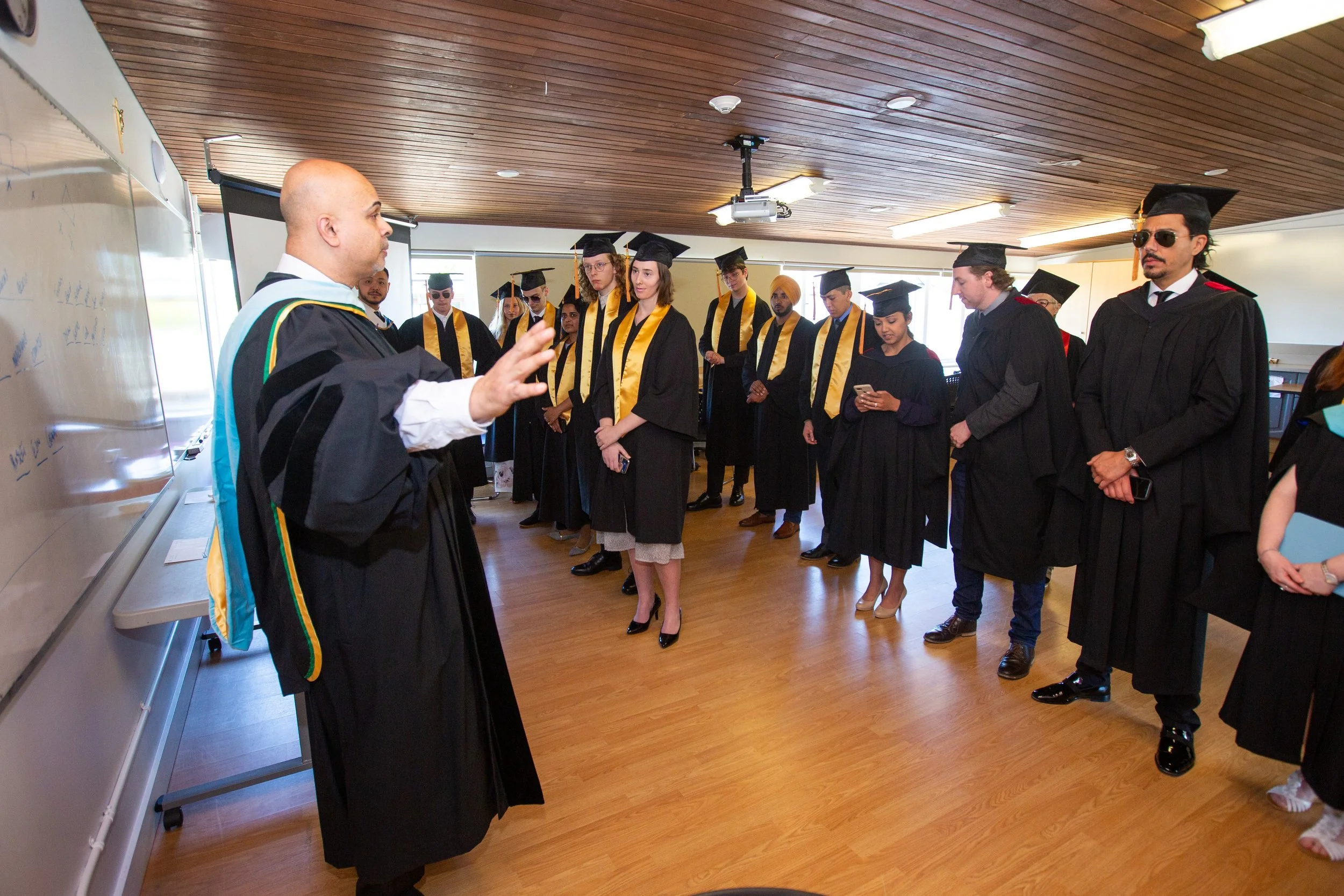 Group of graduates in caps and gowns listening to a professor giving a lecture in a classroom.