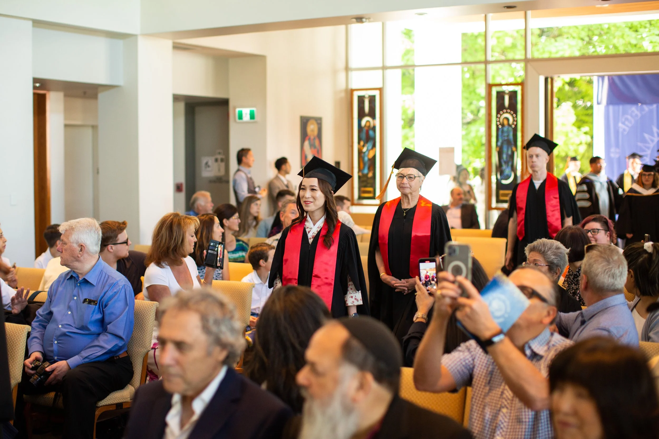 Graduate procession at a university graduation ceremony in a large, well-lit ballroom with large windows, featuring a diverse group of graduates in caps and gowns walking through seated audience members taking photos and watching.