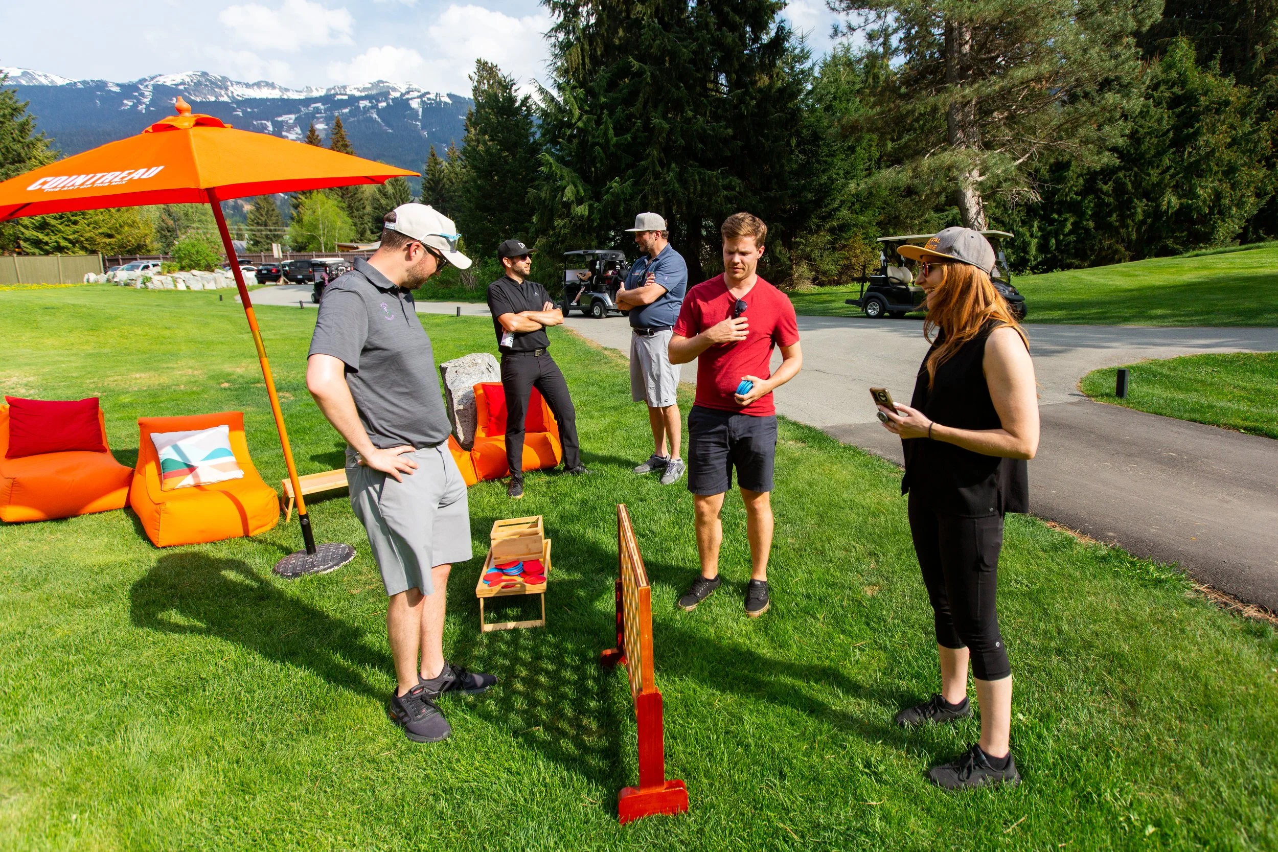 People playing a bean bag toss game on a golf course with trees and mountains in the background.