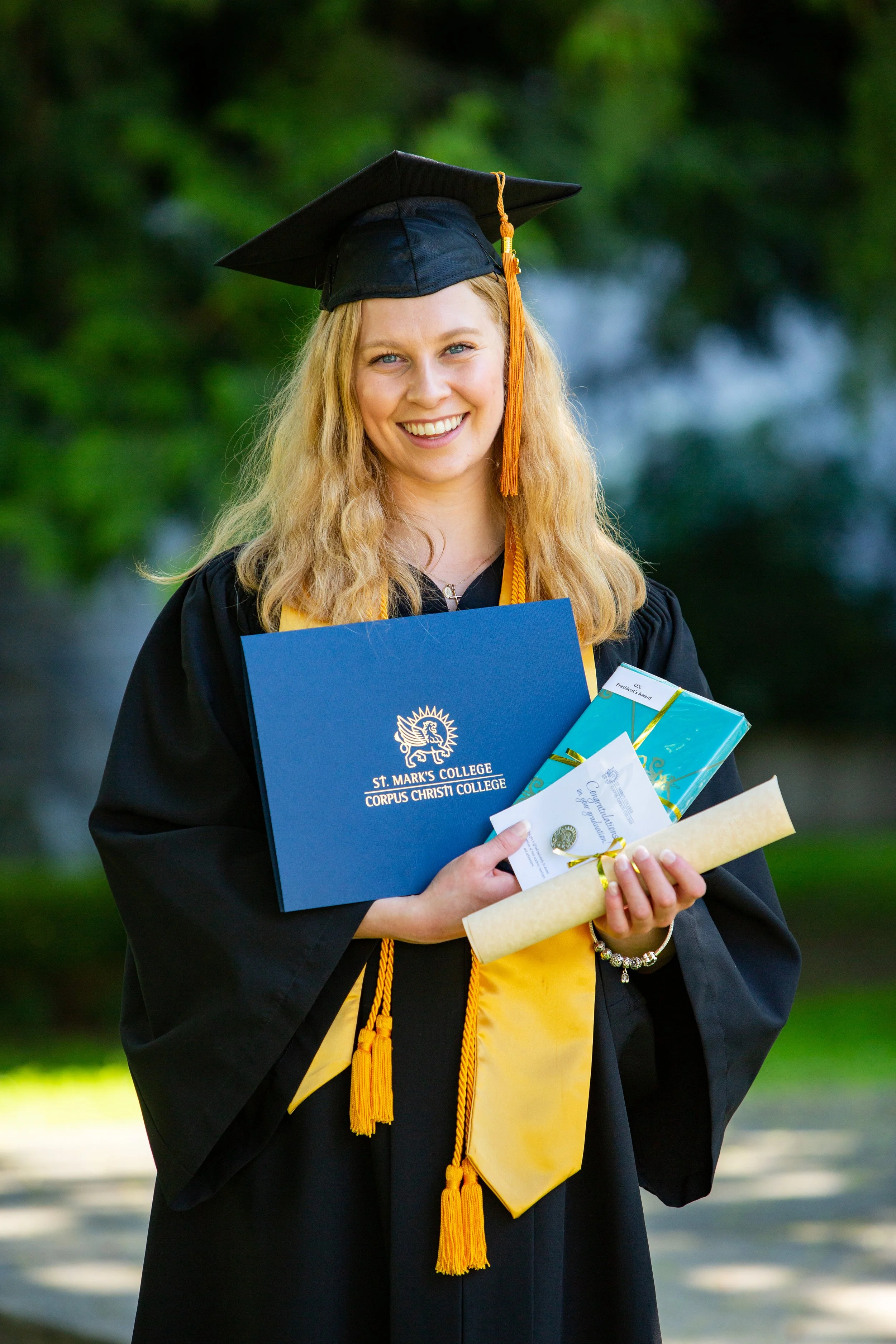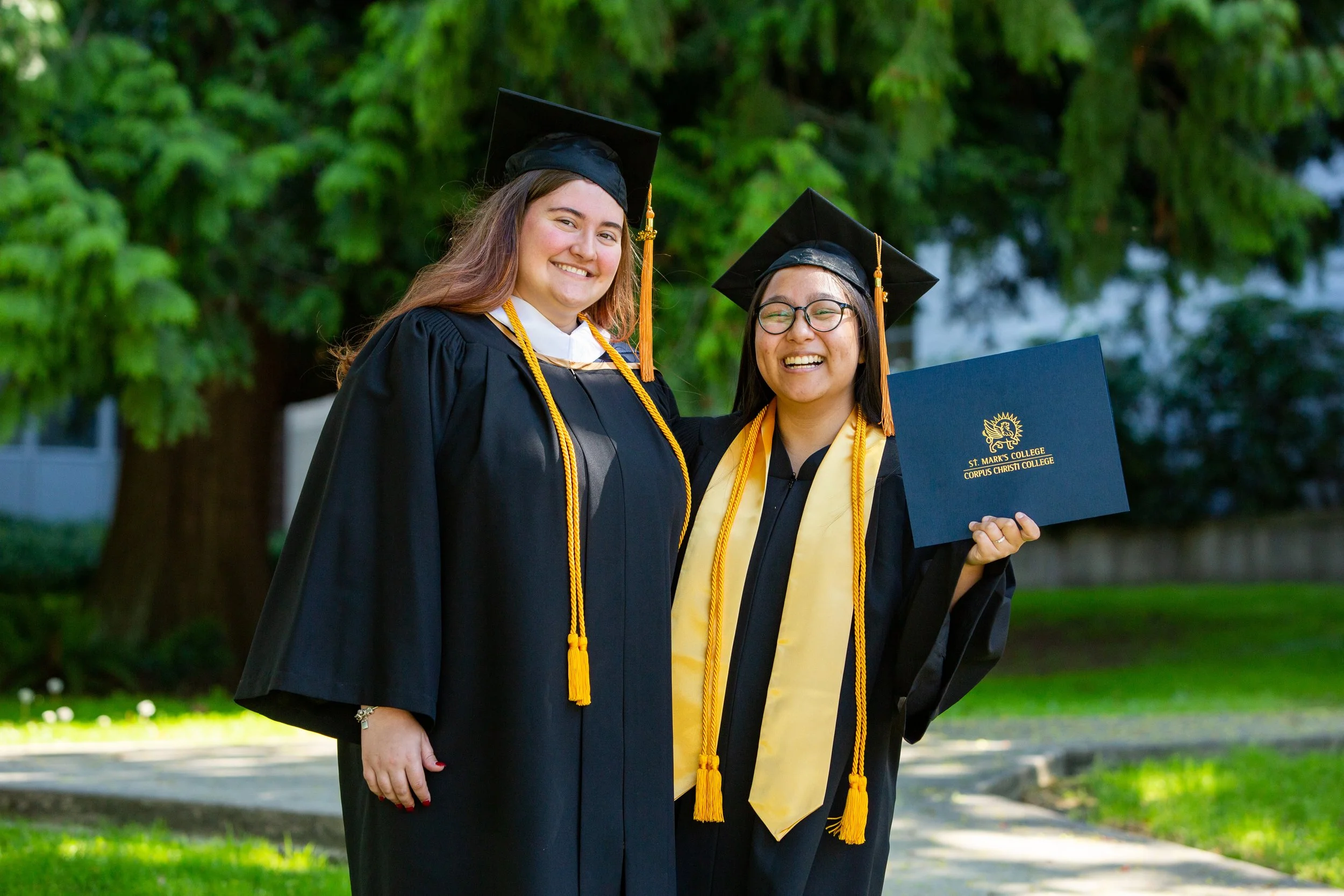 Two young women in graduation gowns and caps smiling outdoors, one holding a diploma with a gold emblem from St. Mark's College, standing on a grassy pathway with trees in the background.