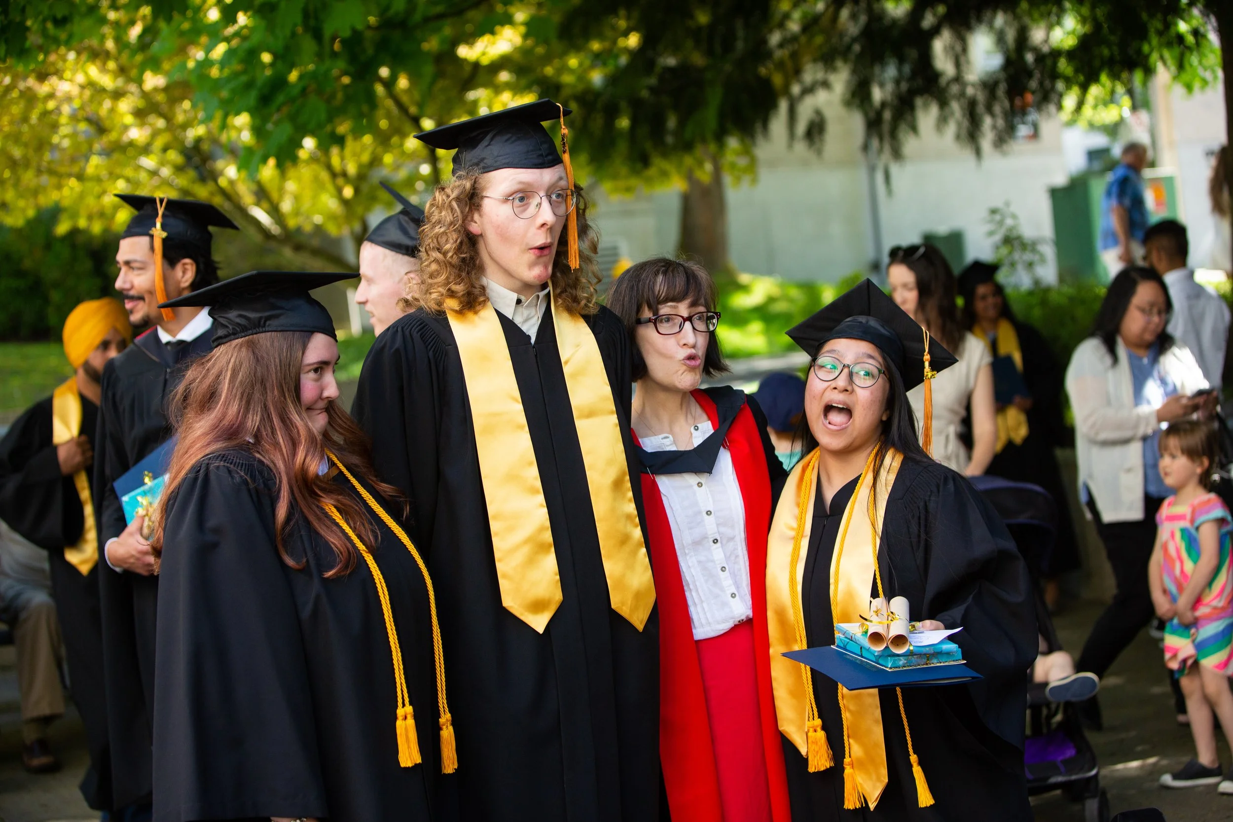 Group of graduates in black caps and gowns, some with gold stoles, celebrating outdoors during graduation ceremony.