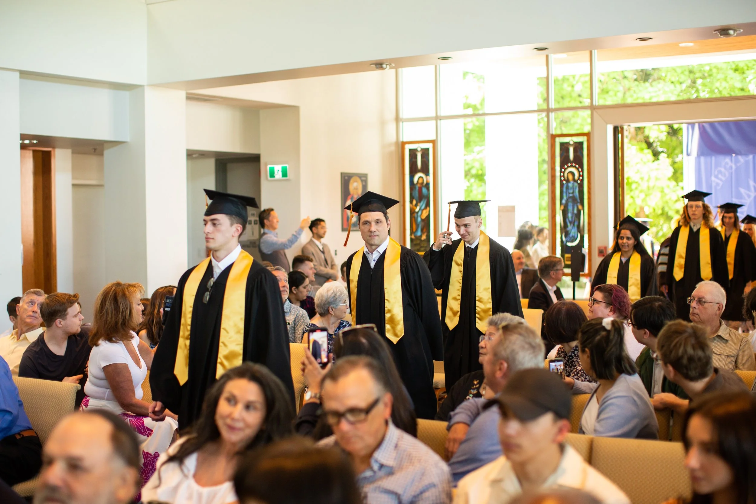 Students in black graduation gowns and caps with gold stoles walking in a graduation ceremony hall filled with seated guests.