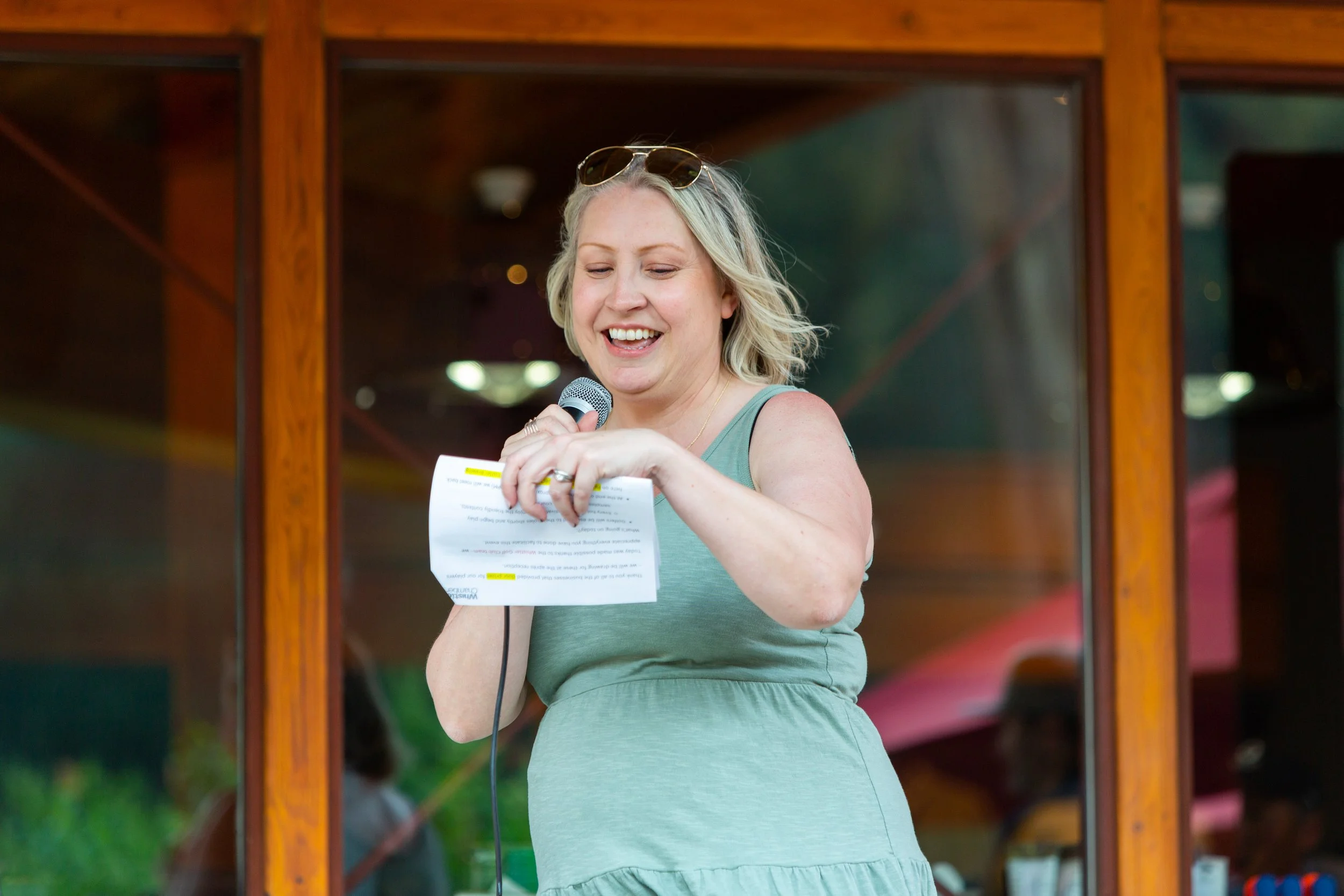 A woman with blonde hair, wearing sunglasses on her head and a green dress, smiling while reading from a piece of paper and speaking into a microphone indoors.