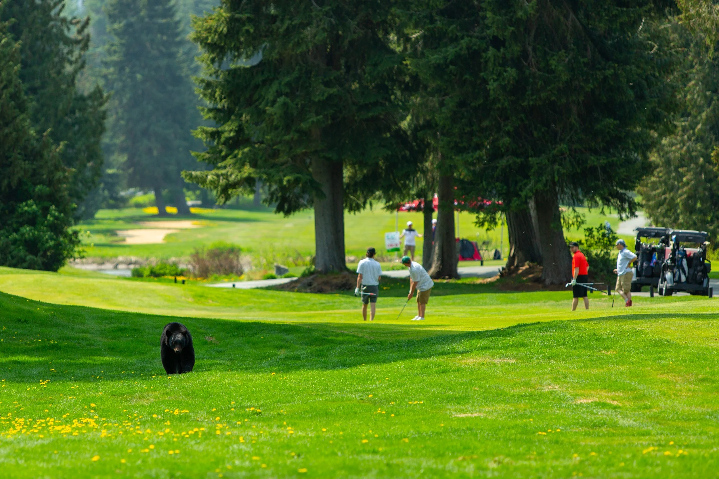 A group of people playing golf on a lush green golf course, with a black bear walking on the grass nearby, large trees in the background.
