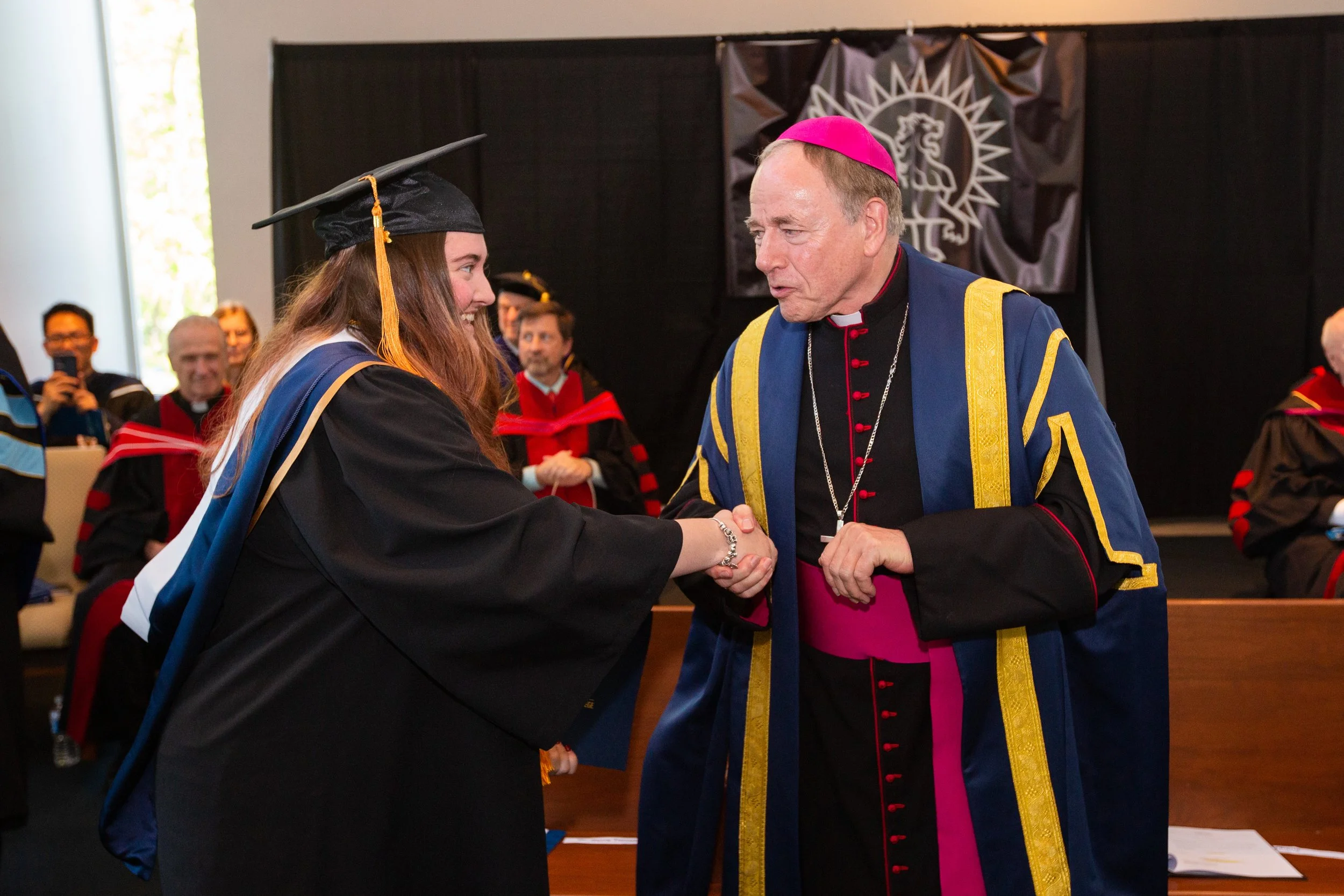 A graduation ceremony where a woman in a black gown and mortarboard shakes hands with a man in academic regalia and a pink bishop's miter, with other academic officials seated in the background.