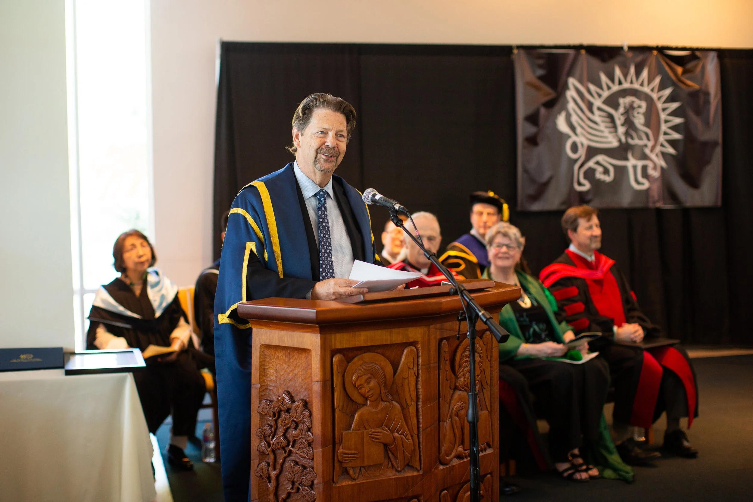 A man in an academic gown is speaking at a podium during a graduation ceremony. Behind him, other graduates and faculty members are seated, and a banner with a winged lion emblem is hanging on the wall.
