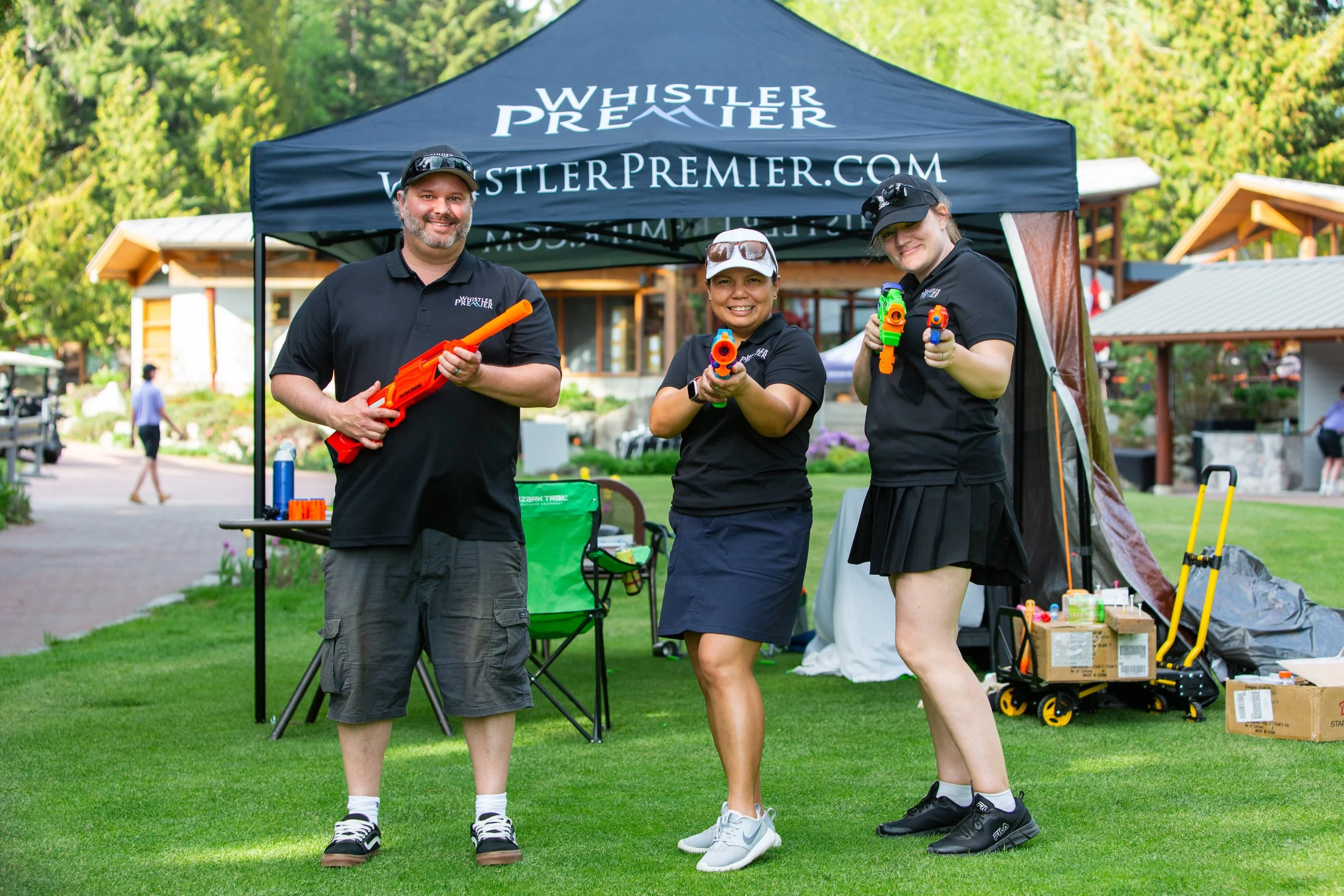 People attending an outdoor event at a green park under a tent. One person is holding colorful water guns, and others are engaged in activities near a table with white tablecloths.