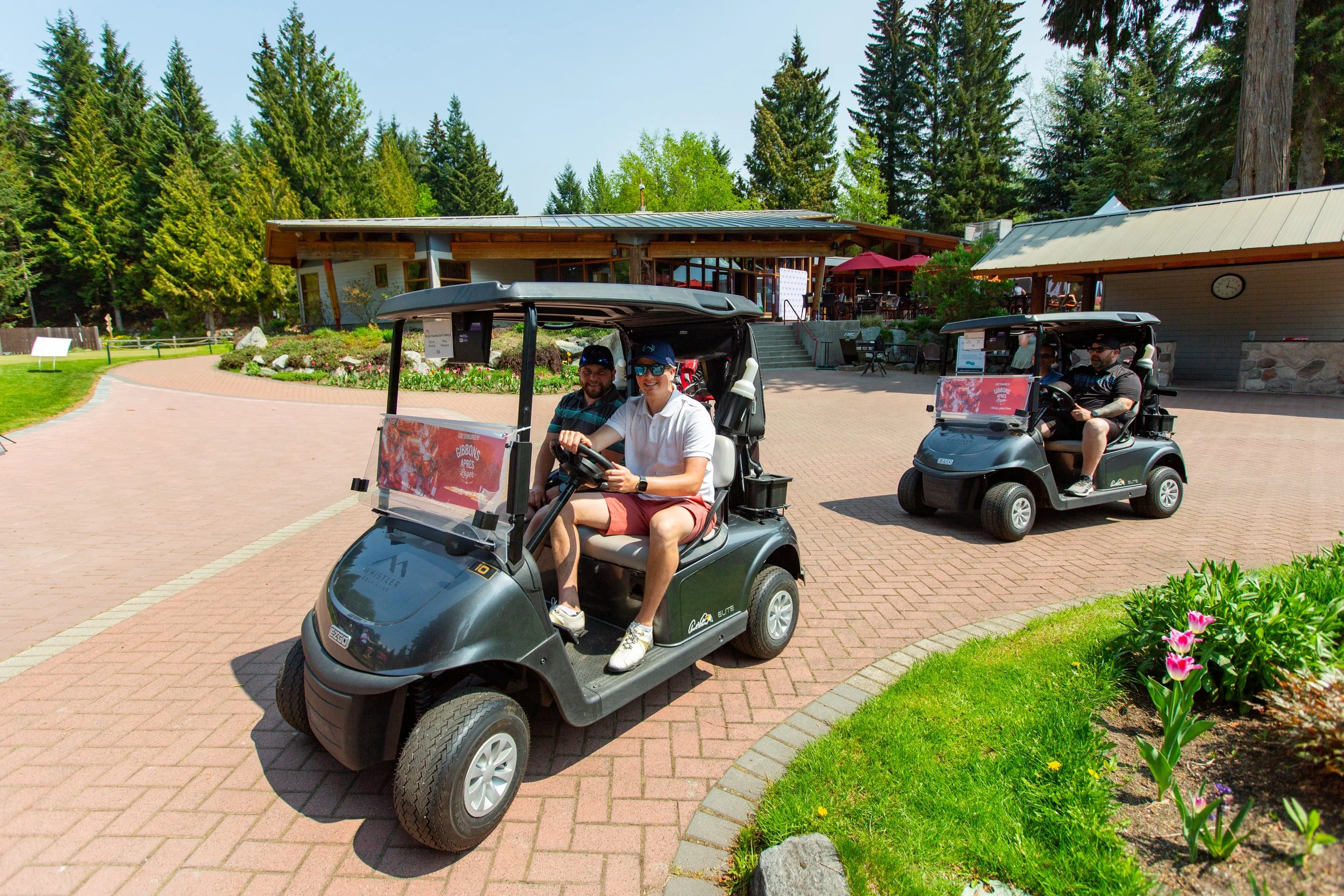Two men riding in golf carts on a brick pathway outside a building surrounded by trees and flowers.