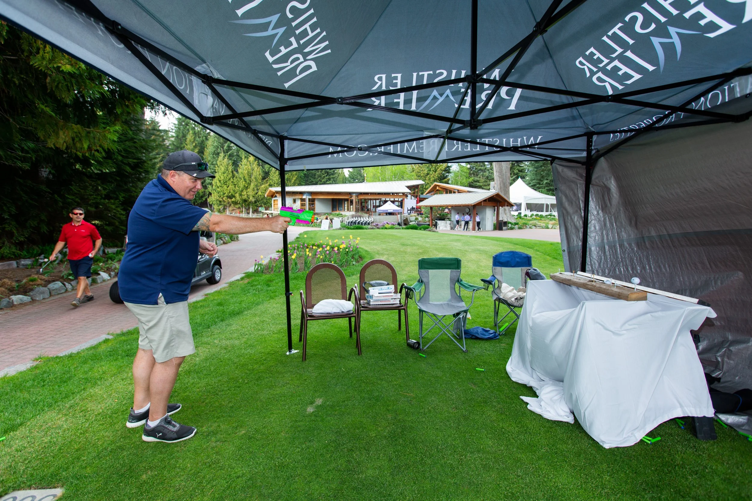 People gather under a white canopy tent at a golf challenge event, with a sign promoting the Whistler Business Golf Challenge and a chalkboard sign nearby. The scene takes place outdoors on a golf course with rocks and trees in the background.