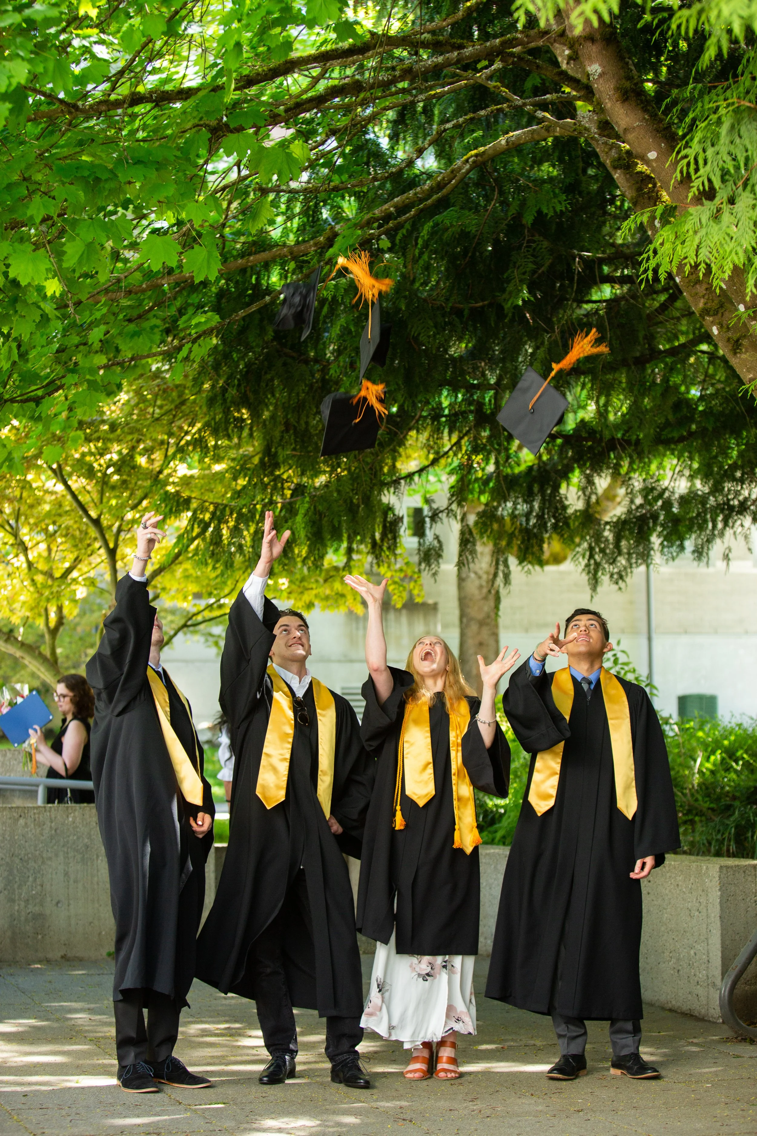 Graduates in black gowns and gold stoles celebrating outdoors as they throw their caps into the air.