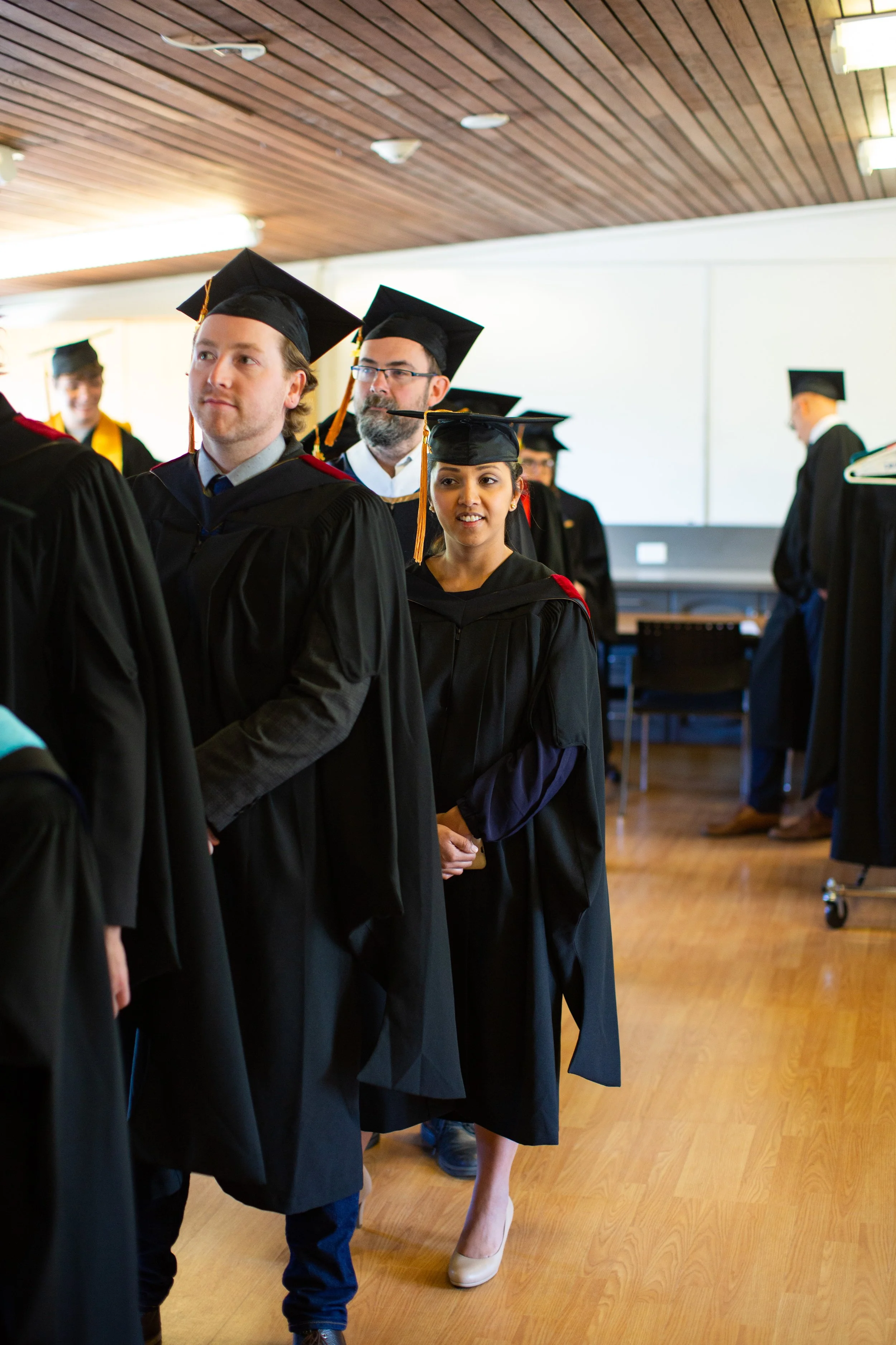 Graduates in black caps and gowns standing in a line during a graduation ceremony indoors.