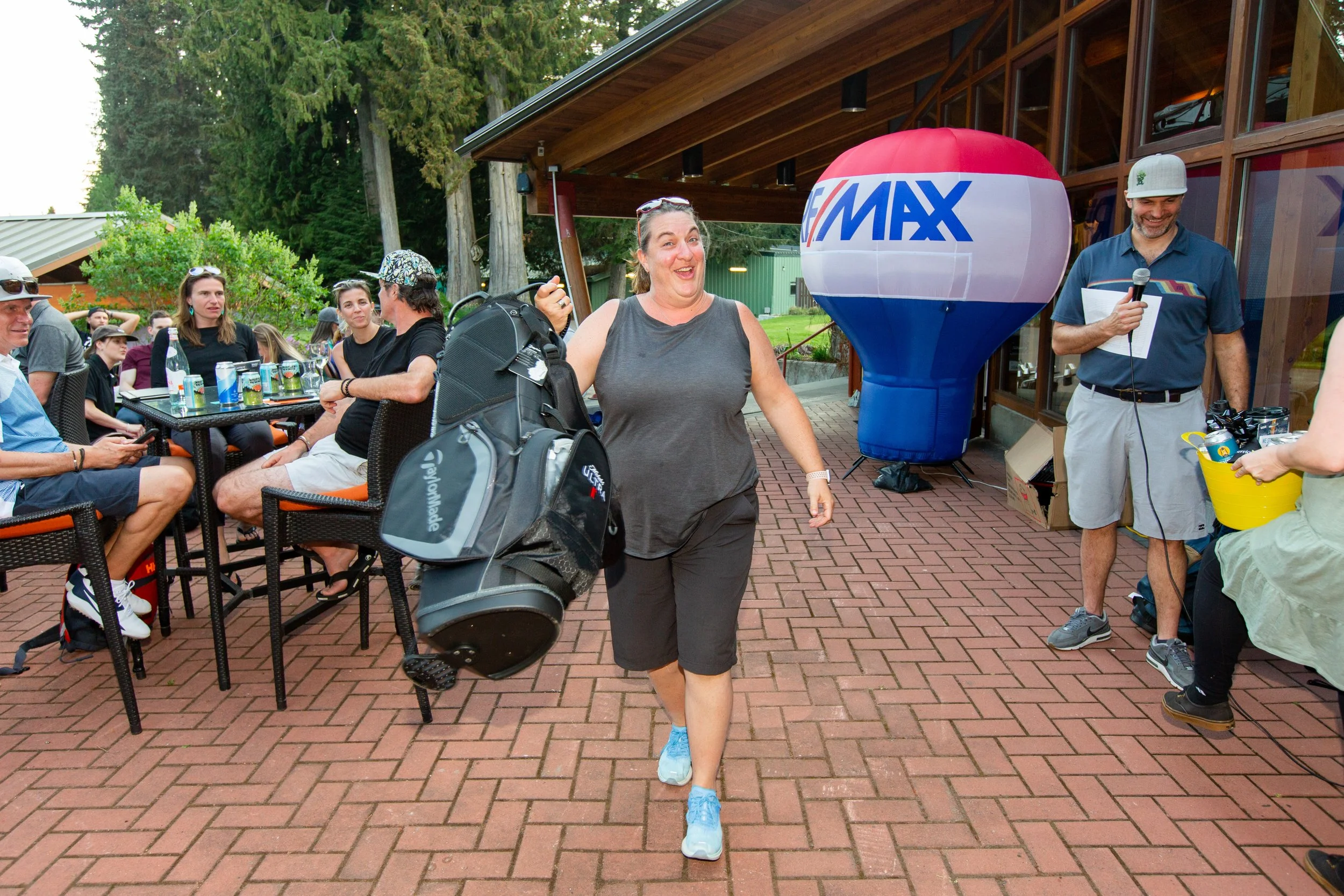 People gathered outside a club or event venue with banners and tables, some with golf bags and equipment, surrounded by trees and flowers.
