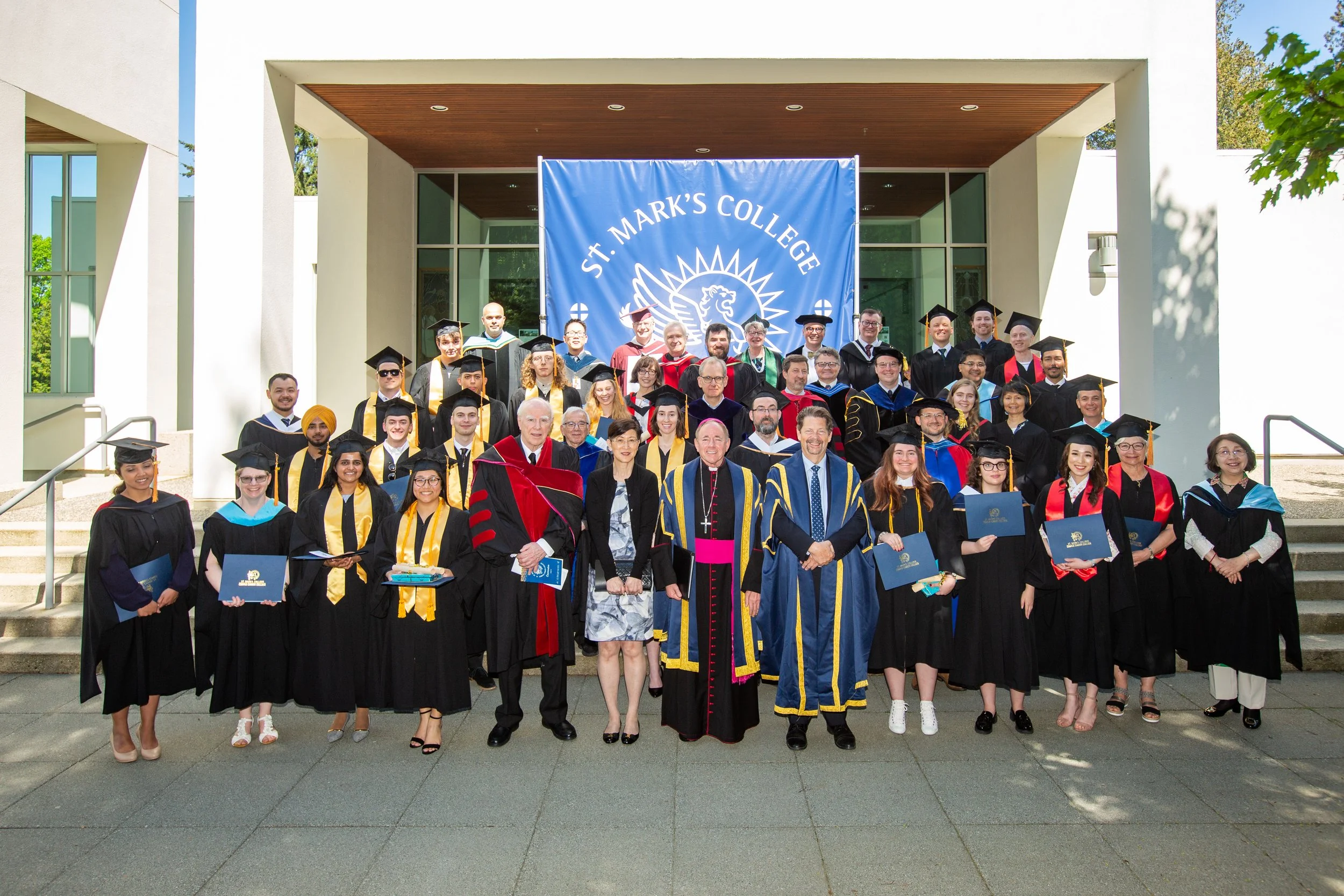 Group of graduates and faculty members in caps and gowns posing for a photo outside a modern building with a large blue banner reading 'St. Mark's College' behind them.
