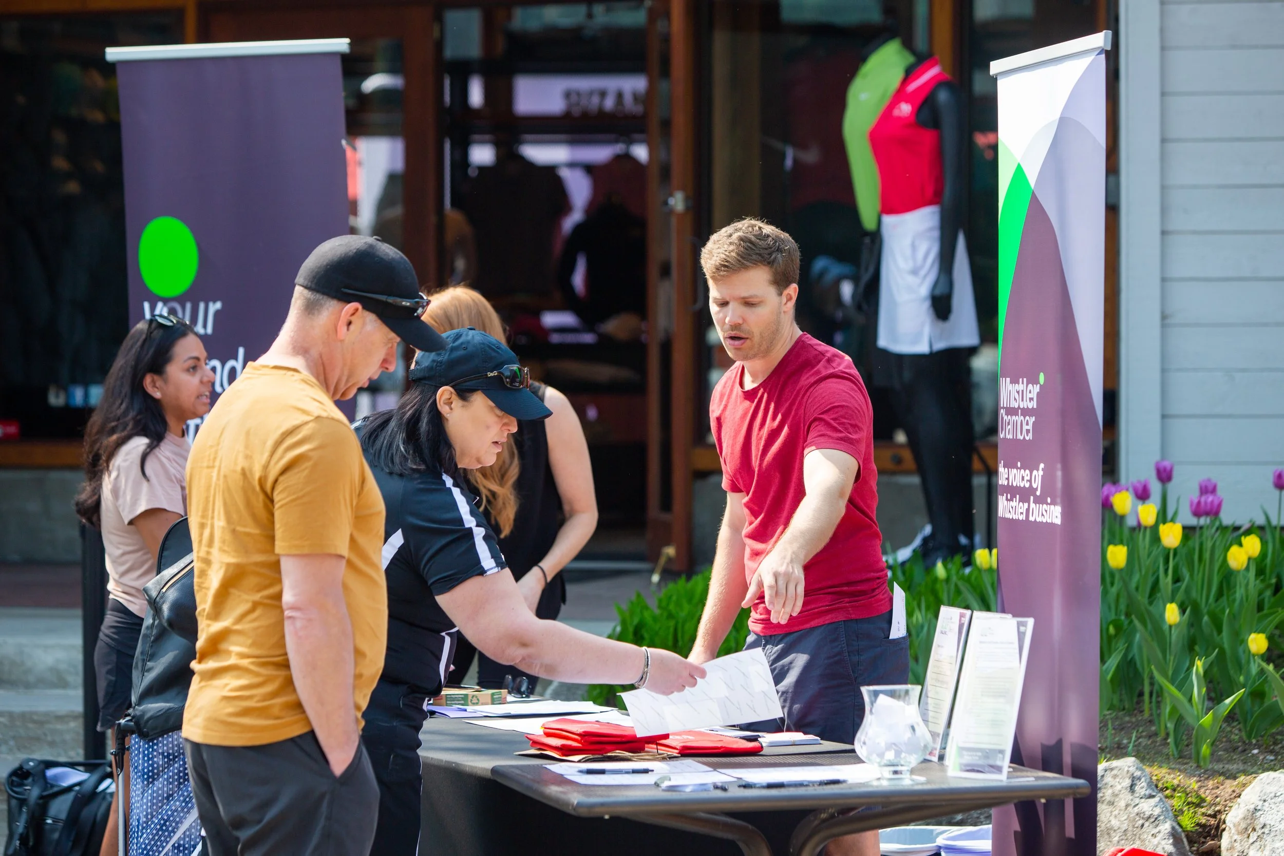 People gathered at an outdoor registration or information table with promotional banners, a glass bowl, and informational materials, in front of a merchandise store with mannequins dressed in sportswear and a garden with tulips.